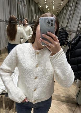 Потный, мягкий кардиган цвета экрю с золотистыми пуговицами. Состояние идеальное. Размер указан L Длина 55 Рукав 63 Плечи 42 По груди 52