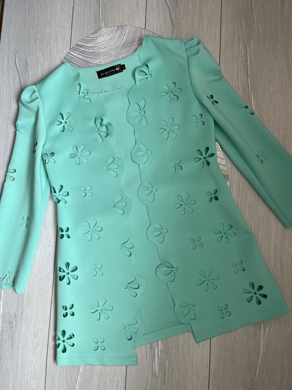 Кардиган, мятного цвета, на бирке размер L, будет на размер М. Содержит принт цветы
