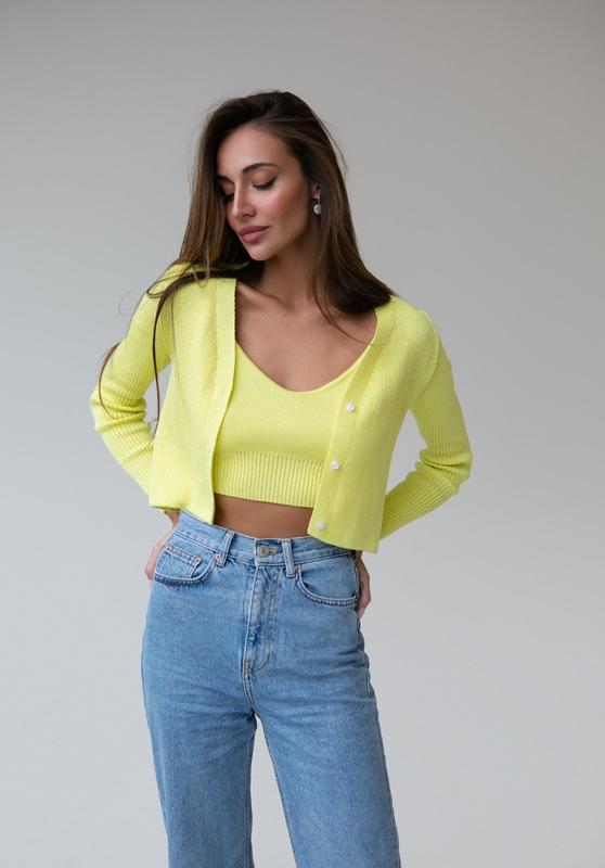 кардиган 25 union в кольорі лайм. Розмір xs-s . Новий , з біркоюі додатковим ґудзиком. Також є топ і сукня в цьому кольорі -теж нові з бірками.