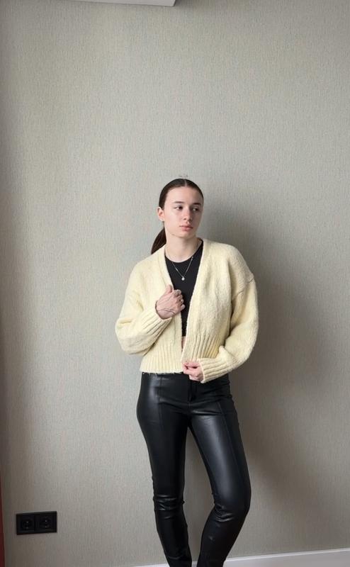 Мінімалістичний кардиган крупної вʼязки у ніжному жовтому кольорі Розмір S Склад: 47% акрил, 30% поліестер, 14% вовна, 9% поліамід.