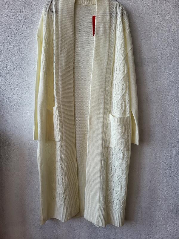 Стильный кардиган, подойдет на 48, 50 размер. Плече приспущене 24 см Длина рукава 50 см Ширина половинки 31 см ПОГ по спинке 62 см ПОБ 60 см Длина 107 см Состав: 100% акрил