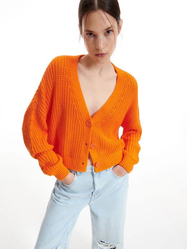 Кардиган вільного крою, виготовлений із пряжі щільної в’язки. V-подібний викот довгі рукави з опущеною лінією плечей Розмір вказаний С, але через крій по факту підійде і на С-М-Л, без дефектів, стан ідеальний