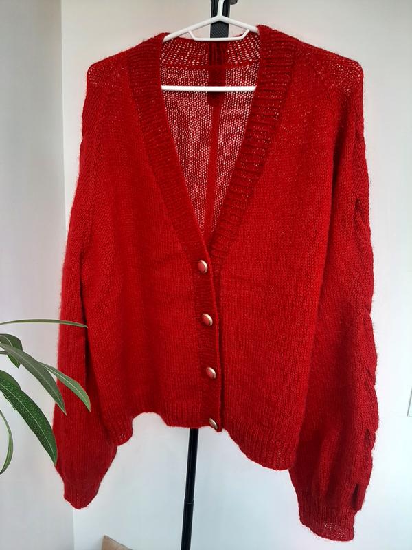 Кардиган в насыщенном красном цвете - идеальный вариант для прохладных вечеров. Мягкая фактура, объемные рукава с косами. Вязаный в одну ниточку, поэтому сам кардиган является легким и приятным на ощупь. Аккуратная посадка делают его стильным и удобным. Застегивается на четыре золотисто-красные пуговицы, которые добавляют элегантный блеск. Материал: полушерсть (40% шерсть, 60% акрил), вес кардигана около 450 г. Размер: M/L, на размер S будет oversize Ширина 59 см Длина 60 см Цвет: ярко красный Детали: фактурные рукава с косами, золотисто-красные пуговицы. Цена: 1250 грн Уход: ручная стирка, сушка на горизонтальной поверхности
