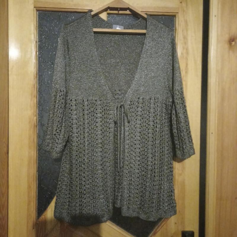 Стильный кардиган, на завязках, рукав 3/4, машинная вязка. Интересный цвет с приглушенным блеском, без люрекса. ОГ 116-130, длина 81 см. Хорошо тянется.
