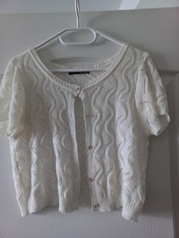 Ажурная кофточка, кардиган на лето, подойдет на размеры S, M. Состав ткани: 68% акрил, 32% полиамид, приятная на ощупь, ПОГ -48, плечи - 40, длина - 44, длина рукава 19.- свет бежевый.