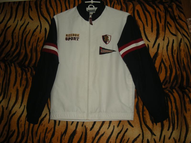 Шикарная фирменная спортивная кофта белого цвета ,черного цвета воротник-стойка и рукава,на рукавах по две красных и одна белая полоски,фирменные надписи,лейбы,застегивается впереди на замок-молнию,низ рукавов и низ кофты на резинке,объем груди-100см.,длина рукава-57см.,длина куртки-61см.
