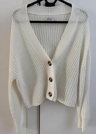 Молочний кардиган без дефектів s-m, є запасний ґудзик.Стан ідеальний Жіночий кардиган Only Особливості: • Догляд: прання до 30 °C на делікатному режимі, прати з подібними кольорами, не відбілювати, прасувати при макс. 110 °C без пари, не сушити в сушильній машині, не піддавати хімчистці. Максимальне усадження виробу 5 %