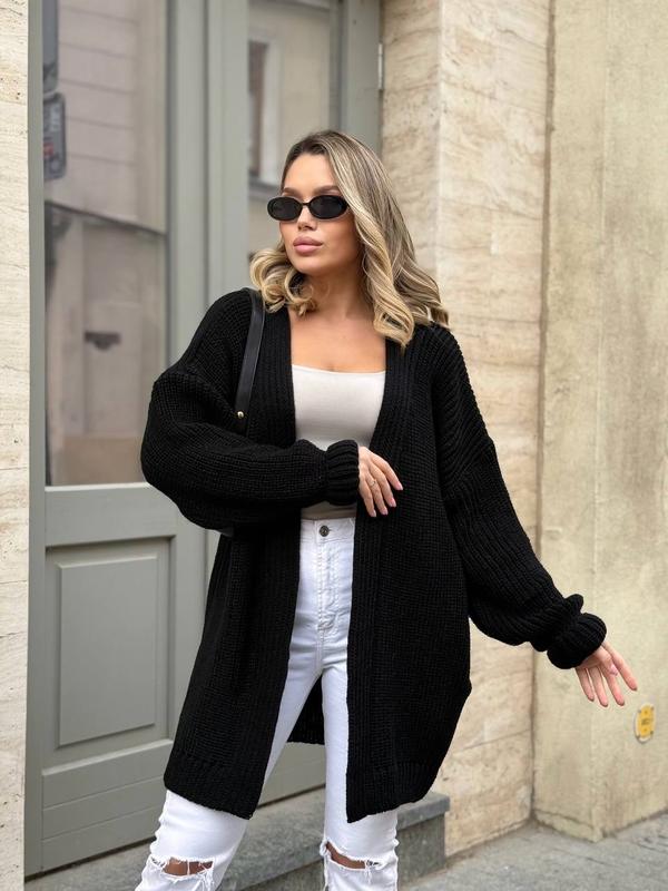ЧУДОВИЙ ВАРІАНТ ДЛЯ ПРОХОЛОДНОЇ ПОГОДИ Кардиган Модель 5009 Модель вільного крою, оверсайз Склад: напіввовна Розмір універсал 44-56 Кольори: молоко, темна пудра, джинс, бузок, чорний, сірий В спокійному стані приблизні заміри: - довжина виробу 80 см - довжина рукава від горловини 73 см