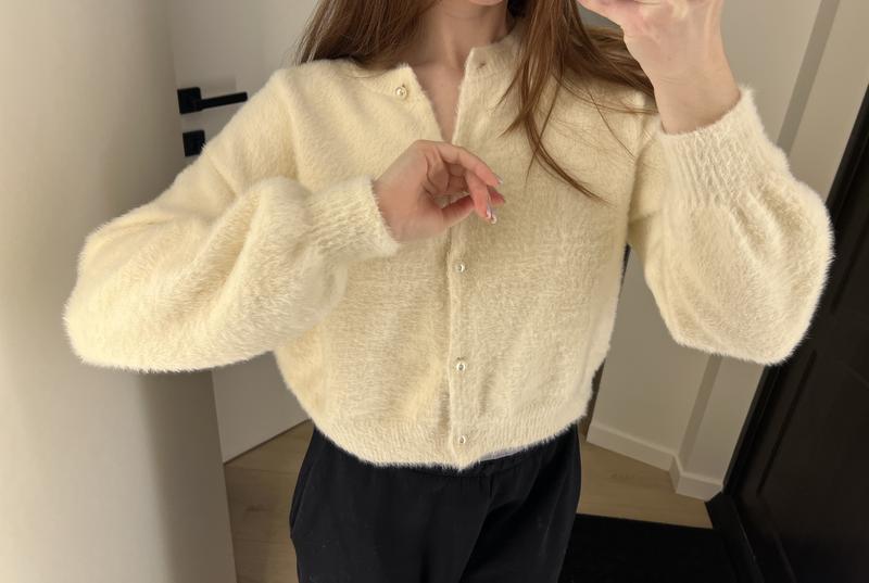 Теплий, мʼякий, приємний до тіла укорочений кардиган на ґудзиках. В новому стані, одягала декілька разів. В ніжному відтінку вершкового масла. В розмірі с. Якщо цікавлять інші деталі, пишіть в особисті повідомлення, з радістю відповім на всі ваші запитання.