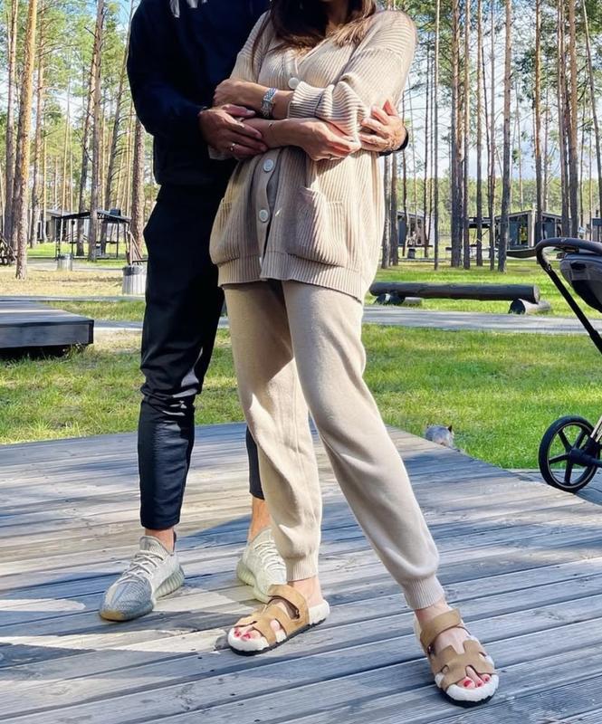 В ідеалі, вдягла 1-2 рази, бо маю такий самий в іншому кольорі. Розмір XS: кардиган ПОГ 67 см, плечі 60 см, рукав 50 см, довжина 76 см, ПОТ 60 см; брюки ПОТ 30 см (гумка тягнеться), ПОС 52 см, довжина 95 см, довжина смужки 24/30 см.