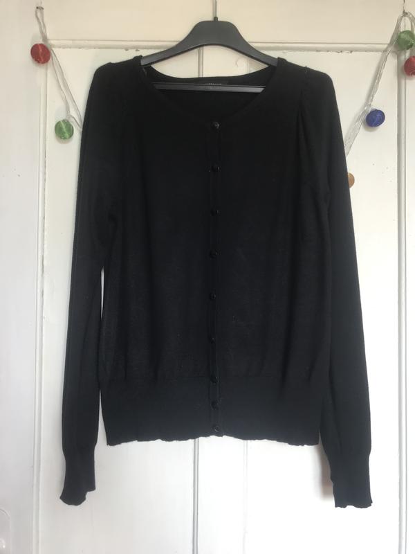 Простий базовий чорний кардиган на защіпках Заміри: Довжина рукава 67 Ширина рукава 12 (8) Пройма 25 Плечі 30 Горловина 21 Груди 48 Ширина по низу 39 Довжина виробу 60 З недоліків-кардиган має зашиті дірочки у кількох місцях (показала на фото) У ціну враховано