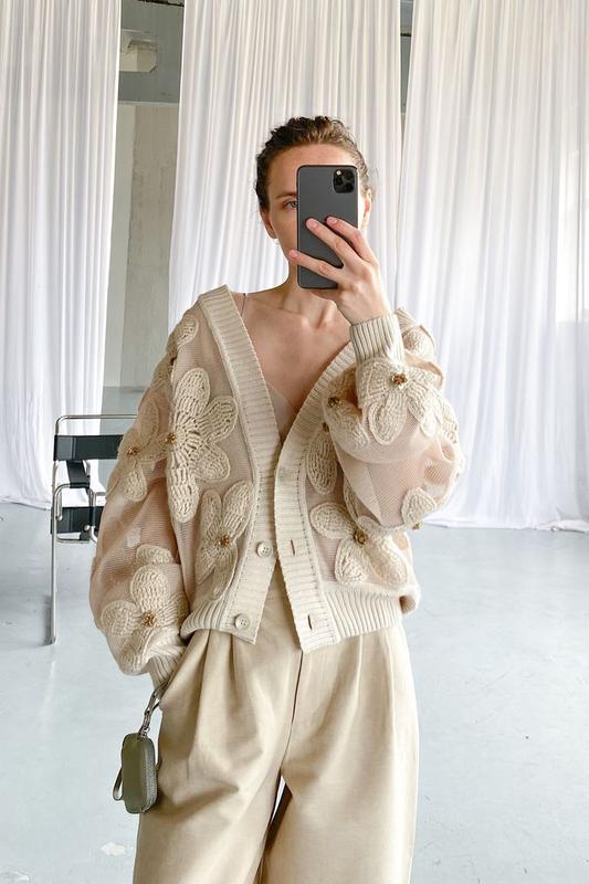 Стильный кардиган цвета кэмэл, на рукавах декор в виде вышитых цветов. Выглядит празднично. Отсутствие бумажной бирки, состояние нового.Подойдет от S до L.