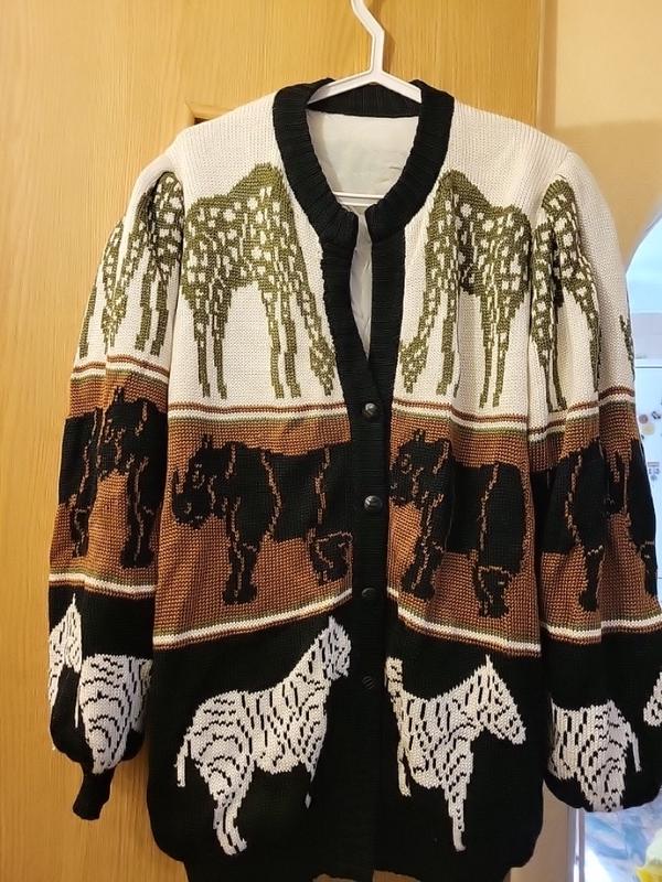 Кардиган шикарный- винтаж.Яркий,оригинальный принт,на подкладке.Как новый,стан нового! ПОГ 58СМ ,РУКАВ 65СМ, ПЛЕЧЕ 15СМ, ДЛИНА 76СМ