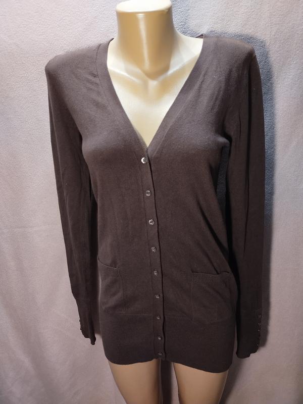 Кардиган темно- коричневий Длина сзади - 71 см Длина спереди - 47 см Под рукавами - 44см Внутренняя длина рукава - 55 см Длина от мышки до низа - 55см Длина рукава - 67см Плече - 12 см Ширина по низу - 34 см Хорошо тянется 70% - бавовна 30% - полиамид