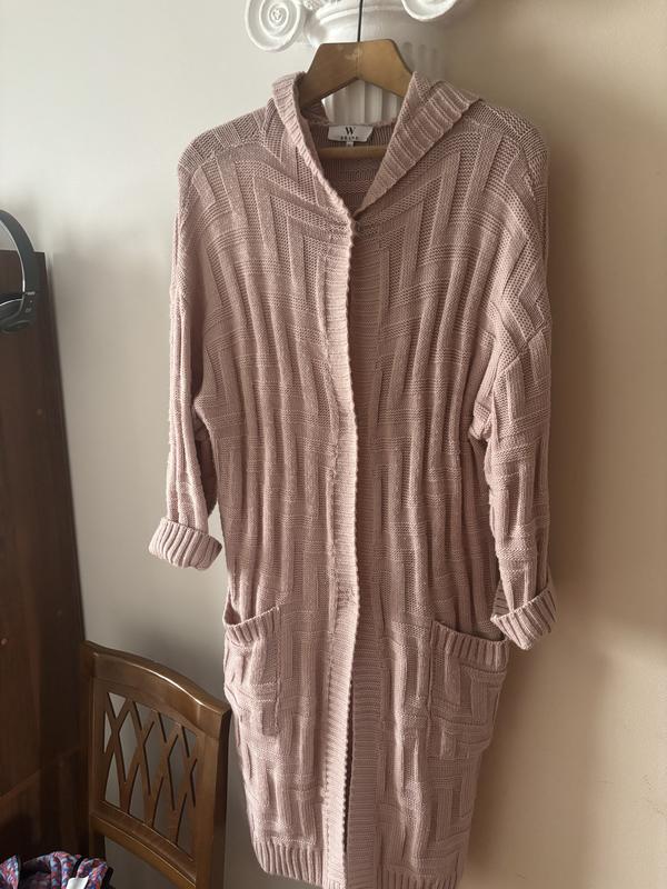 Довгий кардиган пудрового кольору нар.50-52 Гарно сяде на ог-110-115 Українського виробника Теплий Із нюансів-є незначні катишки,які легко можна прибрати машинкою.