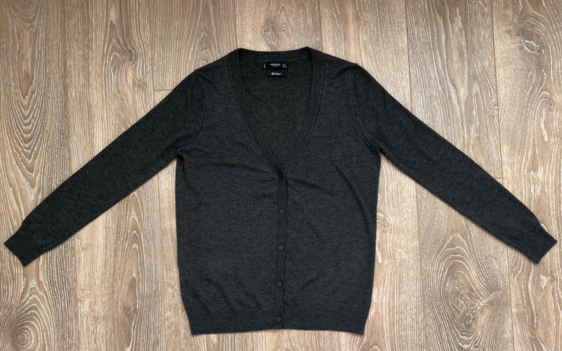 Жіночий кардиган від бренду Mango. Темно-сірий колір, класичний фасон. Довгий рукав, глибокий V-подібний виріз, застібка на ґудзики. Розмір: S Склад: 54% поліестер, 20% акрил, 20% поліамід, 6% шерсть