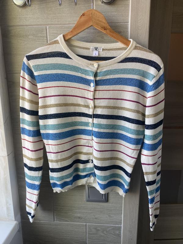 Милий кардиган, коттон і полосочки з люрексу. Дуже гарний 😻 Підійде на С-М.