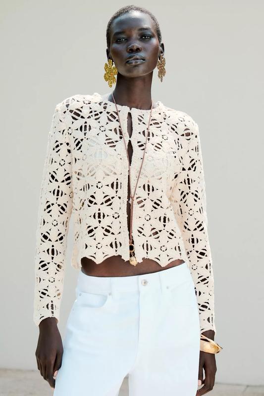 Жакет із круглим коміром і довгими рукавами Zara. Має блискітки в тон та приховані гачки спереду. Колір сірувато-бежевий 📍розмір М ( ПОГ- 48см, рукав від горла - 74см, довжина 53см) Склад : 100% бавовна