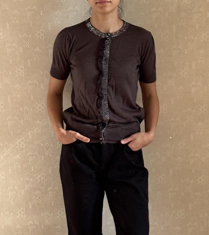 Кардиган Monnari оригинал М. Изысканная кофточка, красивого шоколадного цвета с разовым подтоном. Застежка на кнопках, сверху и низу на жемчужных пуговицах с пайеткой в тон. Состав на фото 6. Наделась один раз..В идеальном состоянии, без нюансов. ПОГ 47 см ПОТ 46 см ПОниз 33 см ПОпройми 21,5 см ПОРверх 13 см, резинка 9 см Длина рукававод плеча 21 см Ширина плечей 36 см Длина плеча 9 см Длина изделия 58 см Новой почтой возможен наложенный платеж с предоплатой в сумме 200 грн После платья возможна при условии предоплаты в сумме 200 грн