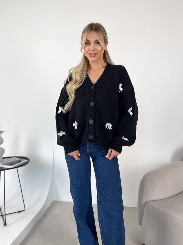 Жіночий кардиган прикрашений бантиками за дві секунди додасть трендових акцентів твоїм вбранням. Це ідеальна гармонія бази та модних тенденцій! Виробник: Туреччина Розмір: 42-46 Тканина: 70% акрил, 30% вовна Колір: чорний Ціна 880 грн Арт:1917
