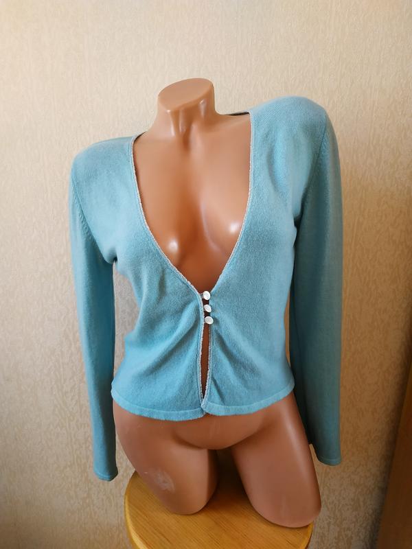 Мягкий кардиган нежного бирюзового цвета (2 фото), украшен бисером. Длина от плеча 49 см, Пог 44 см, низ 41 см, плечи 38 см, рукав 57 см
