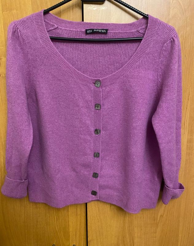 Кашемірова вкорочена кофтинка Autograph. Колір бузок/фуксія, рукава 3/4 з відворотам, квадратні перламутрові ґудзики. Стан ідеальний, без дефектів, без катишів, без усадки. Легка і водночас тепла. Розмір 46-48