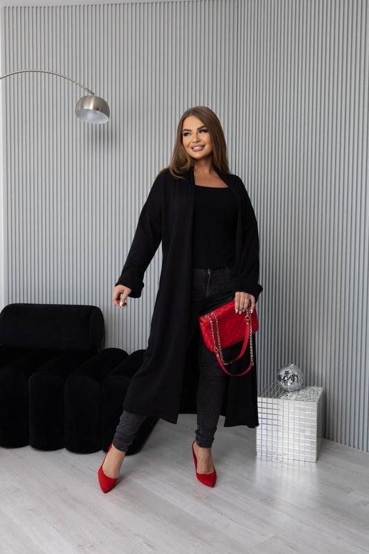 Мш 2 09 Кардиган теплий 🍂 Мод 24/5/мр130/103 ▫Тканина: якісна двухстороння ангора ▫Розмірний ряд: 42-46,48-52 ▫Колір: чорний Заміри: 📍42-46 Груди :110 см Довжина :122 см 48-52 Груди:122 см Довжина :123 см 📍 Мягесенький кардиган важлива річ в гардеробі кожної стильної дівчини 🩶🍂