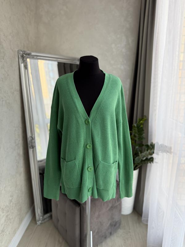 Шикарний кардиган на пуговках, дорогого бренду ❤️ Красивого зеленого кольору💕 Присутні всі лого на пуговках Склад: 60% котон, 40% поліакрил Стан ідеальний🔥 Розмір М-Л (40) Заміри Плечі піб 60 см-приспущені Рукав від плеча 56 см Підпахвами піб 63 см Довжина 72 см