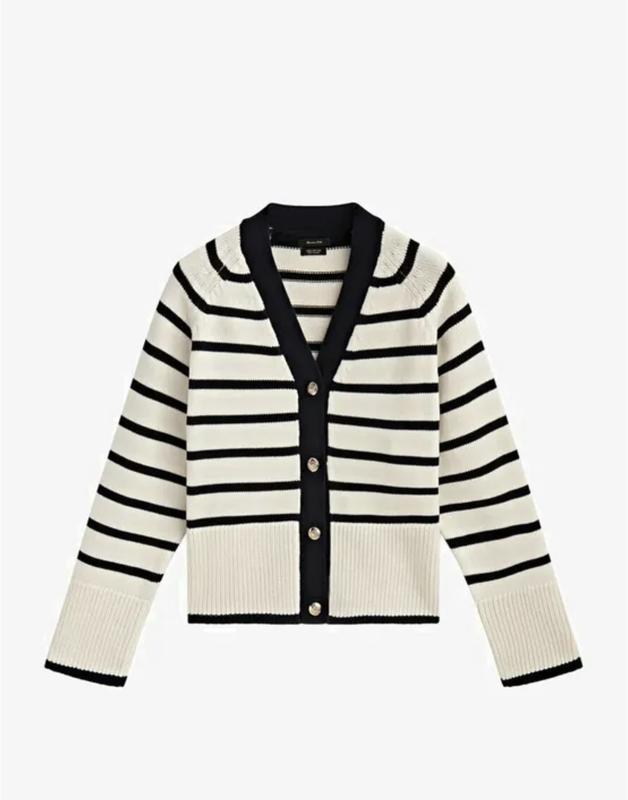 Кардиган виконаний із дуже щільної тканини. В складі 100 процентів бавовни. Гарно виглядаєте і тримає форму. Має вигляд нової речі. Колір молочний з темно синьою смужкою. Напів обʼєм грудей 55см, довжина виробу 60, довжина рукава від горловини 75, ширина рукава 22 .