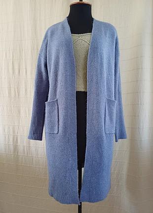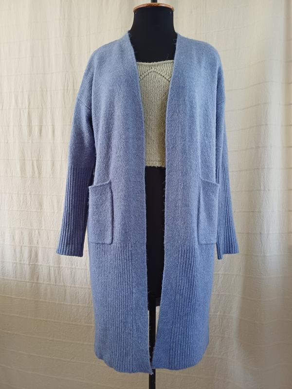 Без застежки, мягкого, основная вязка чулочная, резинка рукавов и низа 2×2, резинка планки горловины 1×1, спущенные плечи, этикетки состава нет, мое мнение- вискоза; но не акрил и полиэстер (я- трикотажница) Замеры: длин.-92, рукав-51, Ог-112, спинка-53, от плеча до плеча-58, резинка низа-30, резинка рукав.-28