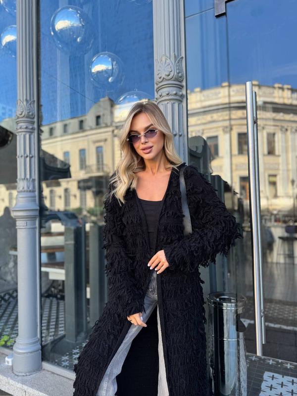 Фактурный кардиган с бахромой — сочетание стиля и комфорта, которое подчеркнет твою индивидуальность🤍 Производитель: Турция Размер: универсальный Цвет: мокко, графит, черный Замеры: Длина: 130см Обьем грудей:120см Рукав от шеи 75см №3814