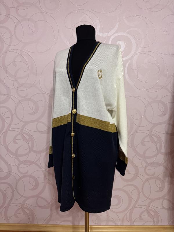 Темно синій низ верх білий розділено золотою смужкою оздоблений золотими ґудзиками. Плечі 55; рукав 53; ширина 56; 86. Стан нового.