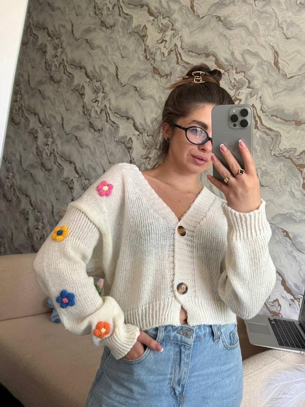 ✨ Ніжність у кожній петлі ✨ Цей вкорочений в’язаний кардиган — справжня знахідка для тих, хто любить жіночність з характером. 🔘 Застібається на акуратні ґудзики спереду, має зручний фасон, що підкреслює талію. 🌸 Родзинка моделі — вшиті в’язані квітки, що додають образу ручно зробленого шарму та романтики. 🧶 Матеріал приємний до тіла, ідеальний для міжсезоння або прохолодних вечорів. - розмір : універсальний (XS-M) ; - матеріал : бавовна ; - артикул : TKB1, TKB2 - ціна : 800 грн