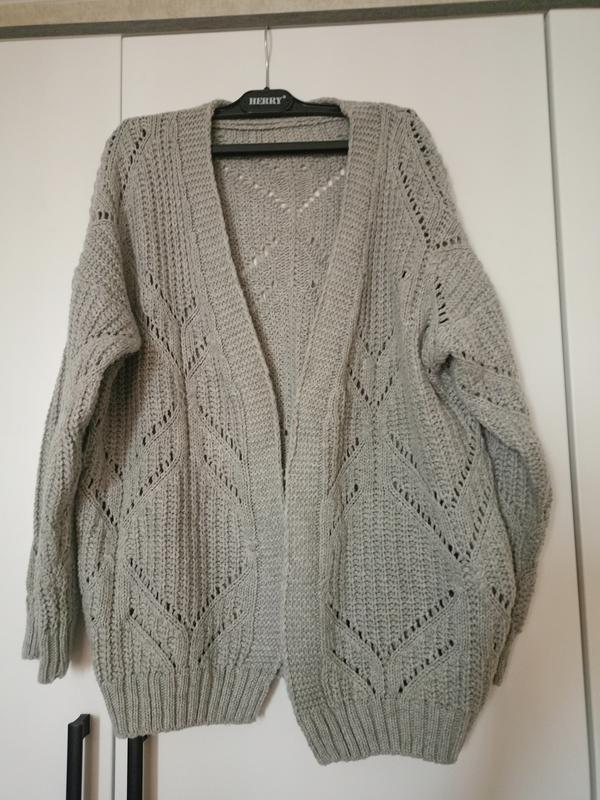 Серый вязаный кардиган, без пуговиц, приспущенные плечо.. Идеален для прохладных вечеров. Шин'рина 55 см, длина рукава от шва 43 см, длина по спинке 63 см, плечо 21 см. Подойдет на размер 44-48. Обращайтесь для получения более детальной информации.