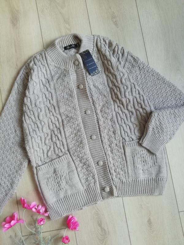 Новой кардиган. Размер указанного М, L. Ориентируйтесь на замеры. Длина кардигана 64 см. Полуобхват груди 53 см. Полуобхват низа (рызинки) 45 см. Длина рукава от горловины 72 см. Состав 100%акрил. Стан новой вещи.