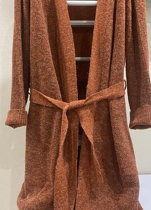 Кардиган рудого кольору, під пояс, заміри готового виробу в стані спокою пог70см, пос70см, довж. рукава від плеча( плече опущене) 56см, , довж. 97см