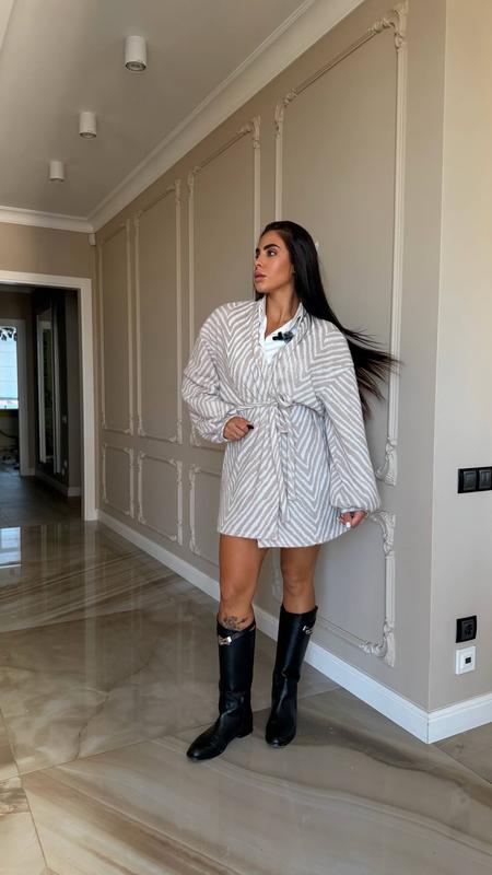 Виконаний з вʼязаної тканина з м’яким ворсом. Дуже теплий, неймовірно приємний на дотик — хочеться носити щодня! Ідеальний на осінь, прохолодні вечори або як стильний верхній шар. Довжина: 120 см Гарно виглядає з будь-яким взуттям, від кедів до чобіт. Заміри по виробу: 42-54: ОГ та **********: ОГ та ОС 126- 150
