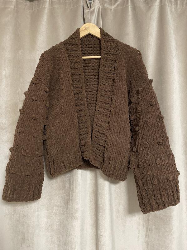 Кардиган з плюшевої пряжі. Довжина - 63 см. Ширина - 58 см. Довжина рукава (від горловини) - 68 см.