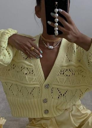 Пропоную до продажу трендовий в'язаний кроп-кардиган ніжного лимонно-жовтого кольору. Ця кофта — ідеальне доповнення до вашого весняного чи осіннього гардеробу, що додасть яскравості та затишку будь-якому образу. Фасон: Кроп-довжина (коротка) та оверсайз-крій створюють модний, розслаблений силует. Особливість: Приваблива ажурна в'язка на плечах та по всій довжині рукава робить кардиган повітряним та елегантним. Рукава: Об'ємні, призібрані рукава-ліхтарики з манжетами підкреслюють сучасний стиль. Деталі: Застібка на милі дерев'яні ґудзики. Колір: Приємний лимонний відтінок, який легко комбінувати з чорним, білим, денімом та іншими базовими кольорами. Стан: Відмінний Розмір: Вказаний S (за рахунок оверсайз-фасону підійде також на M).