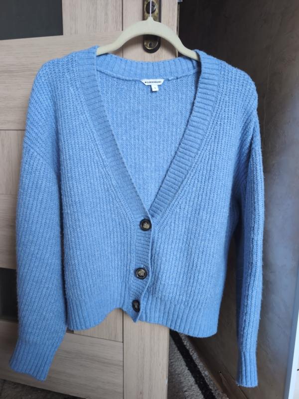 Кардиган, размер s, приятного голубого цвета, длина 52, ОГ 58, ОТ 48, рукав от шеи 67