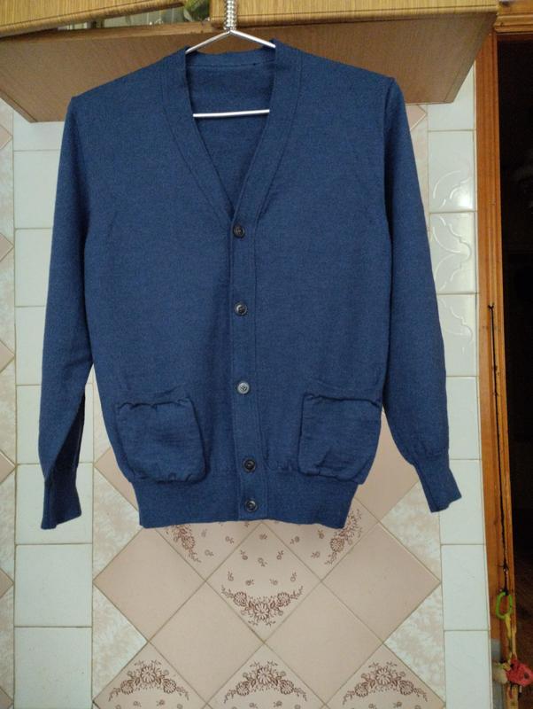 актуальный в этом сезоне, бабушкин, кардиган, очень хорошее качество, трикотаж плотный, мягкий, красиво садится на женскую фигуру. ПОГ50, длина 60, рукав 58, плечи 42. Указан размер 48, он едет на M, цвет серовато синий