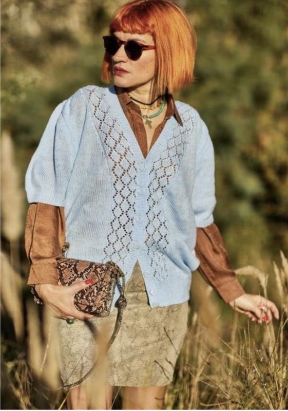Ажурний кардиган блакитного кольору, бірки зі складом немає але на дотик акрил і шерсть розмір овер, на ґудзиках. Довжина 62, рукав від ворота 40, грудях 58, по низу видання 42, тканина тягнеться і виміри в полуобхвате