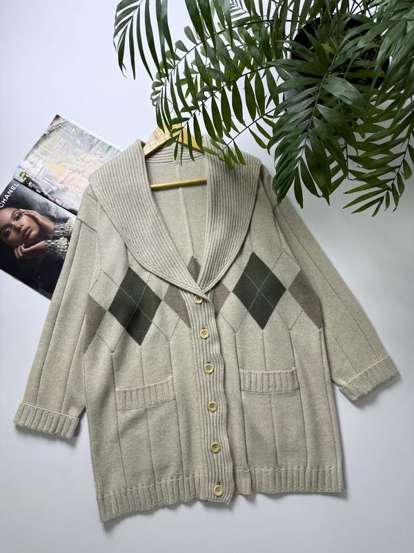 ПОГ 60 см Довжина 78 см Рукав від горловини 69 см Верхня етикетка відсутня, але знайшла фото кардигану в інтернеті разом з фото етикетки (останнє фото). Внутрішня етикетка зі складом присутня