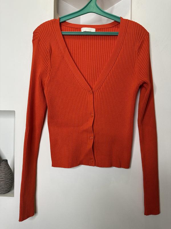 Состояние идеальное Известного бренда Оранжевого цвета Ткань в рубчик Отлично тянется Застёгивается на пуговицы Бирка с размером и составом срезана, ориентируйтесь по замерам Замеры: Плечи 45 Рукав 63 ПОГ 39/55 Низ 34/55 Длина 52