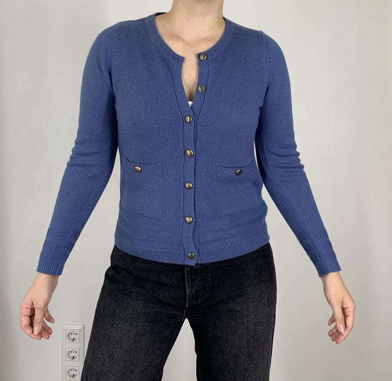 Кардиган синього кольору Розмір М У складі 30% вовна, 70% акрил Не колеться Довжина 53 см, довжина рукава 63 см, напівобхват грудей 46 см Стан ідеал Вдягнуто на розмір Л, зріст 167