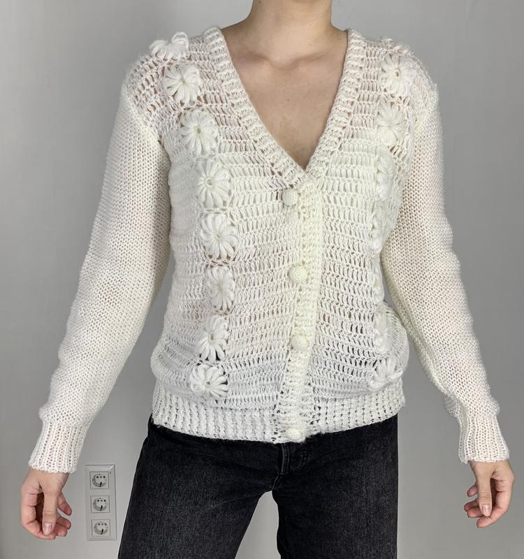 Кардиган молочного кольору Розмір Л У складі 100% акрил Довжина 53 см, довжина рукава 64 см, напівобхват грудей 51 см Стан дуже хороший Вдягнуто на розмір Л, зріст 167