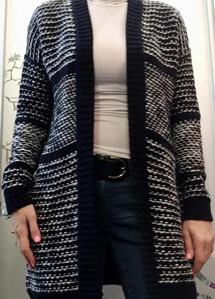теплий в'язаний кардиган, Next, жіночий розмір 10 на об'єм грудей 84-90 см колір темносини з білим, без застібки, бічні кишені, крій рукава реглан Виміри: довжина 80 см, об'єм грудей 102 см, довжина рукава від плеча 60 см