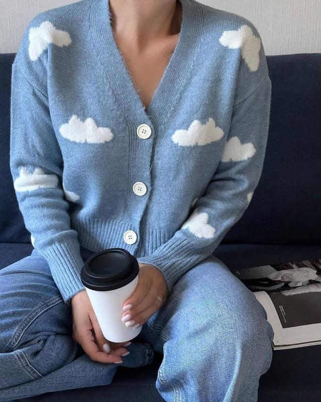 Кардиган із хмаринками ☁️ М’який трикотажний кардиган з ніжним принтом у вигляді хмар. Комфортна посадка, зручна застібка на ґудзиках Виробник: Туреччина Склад: 20% поліестер, 75% акрил, 5% еластан Розмір: універсальний (42-46) Колір: молочний, блакитний, беж, сірий Ціна 780 грн Замiри: Довжина: 51 см Обхват грудей: 100 см Довжина рукава від горловини: 63 см Ширина низу: 45 см Арт: 0062
