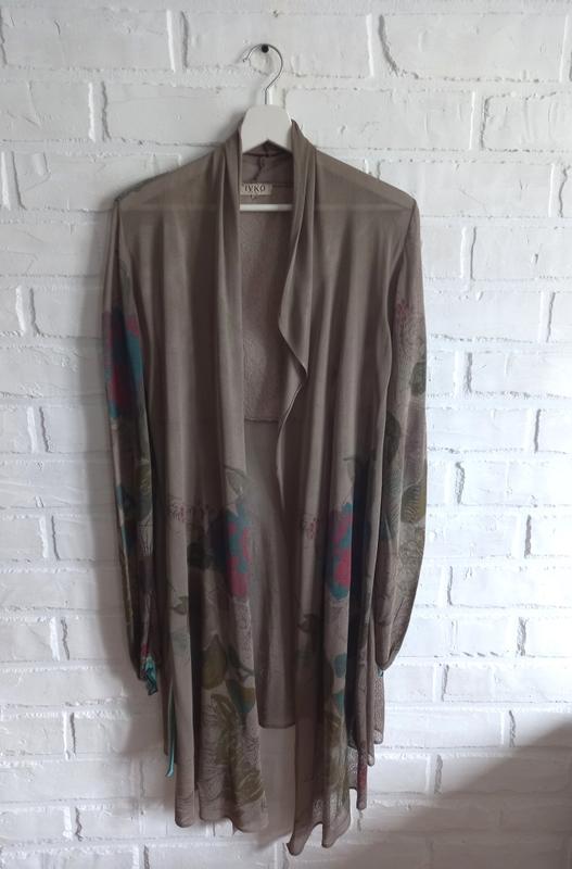 Легкий кардиган Ivko, цвета латте с цветочным принтом, тонкая, полупрозрачная погремушка, бирка со составом срезанная, скорее всего всего это вискоза, размер S, в идеальном состоянии (имеется пар малозаметных зацепок, показала на 2 последних фото) ПГ - 41+ см, ШП - 40 см, длина рукава - 72 см, длина - 86-106 см