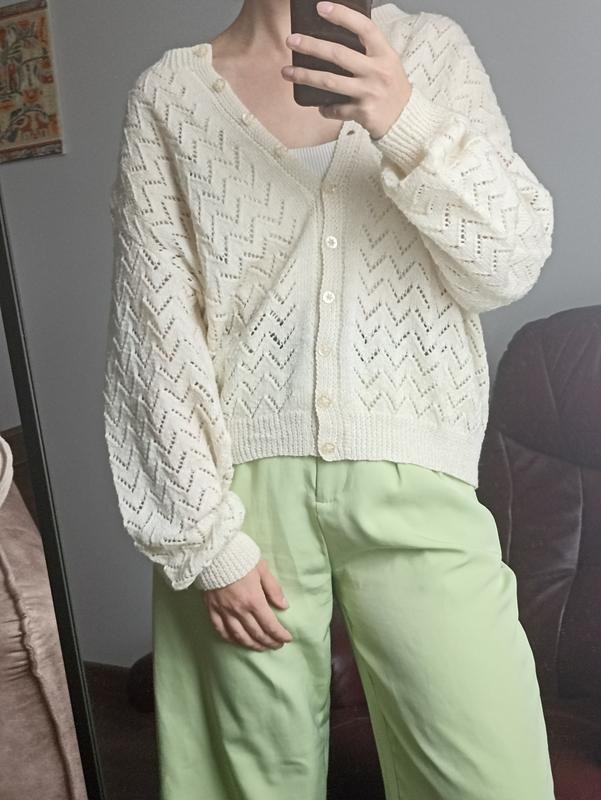 очень милая кофта на пуговицах, длина рукава 60, длина по спинке 60, полуобхват груди 62